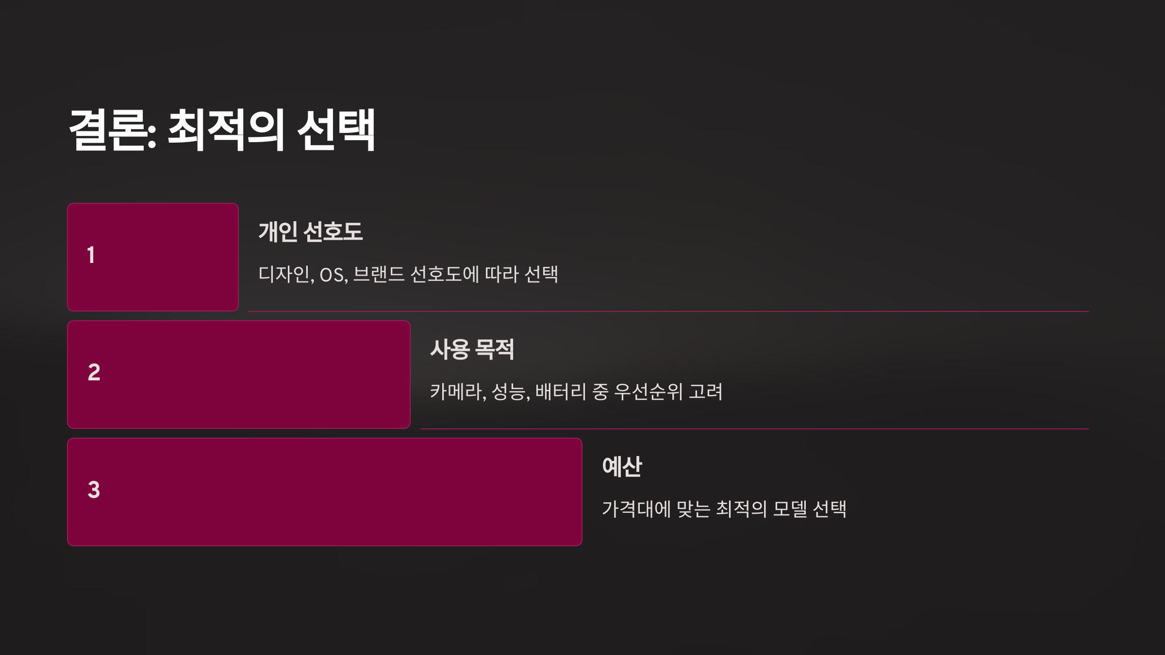 최신 스마트폰들은 다양한 기능과 성능을 제공하며, 사용자의 필요와 예산에 맞는 제품을 선택하는 것이 중요합니다. 어떤 제품이든 자신의 일상과 완벽히 맞아떨어지는 것을 찾는 것이 핵심입니다.