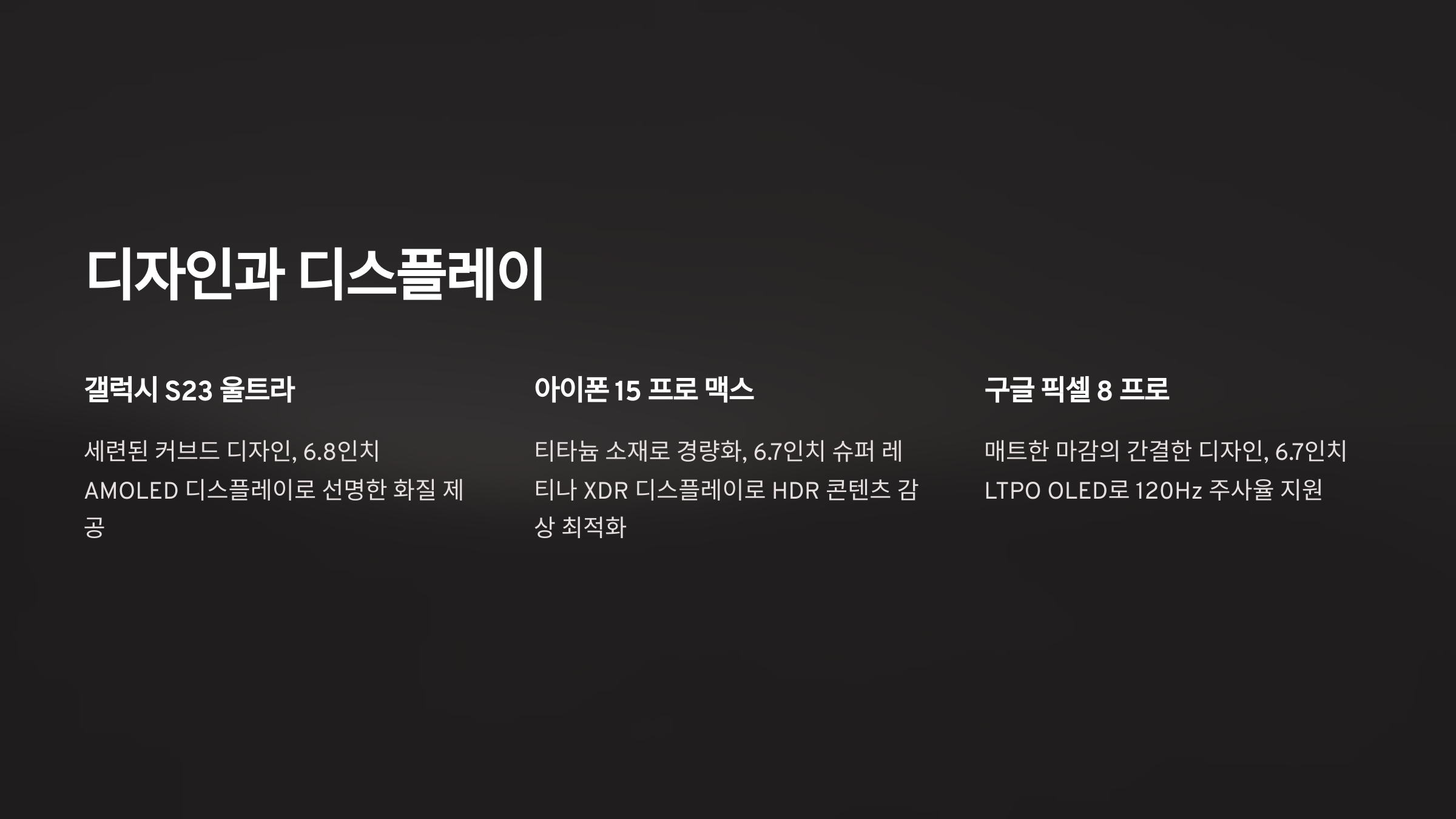 - 구글 픽셀 8 프로: 매트한 마감과 간결한 디자인으로 구글의 디자인 철학을 보여줍니다. 6.7인치 LTPO OLED 디스플레이는 120Hz 주사율을 지원하여 부드러운 스크롤링을 제공합니다.