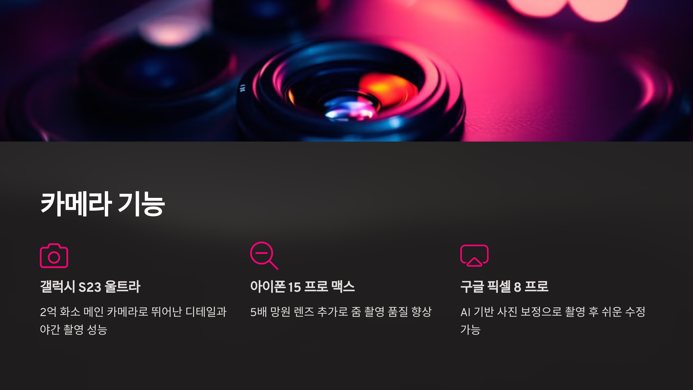 카메라는 현대 스마트폰의 가장 중요한 기능 중 하나입니다. 최신 모델들은 혁신적인 센서를 도입하고, 소프트웨어 기반의 사진 처리 기술을 활용하여 뛰어난 사진과 동영상 품질을 제공합니다.
