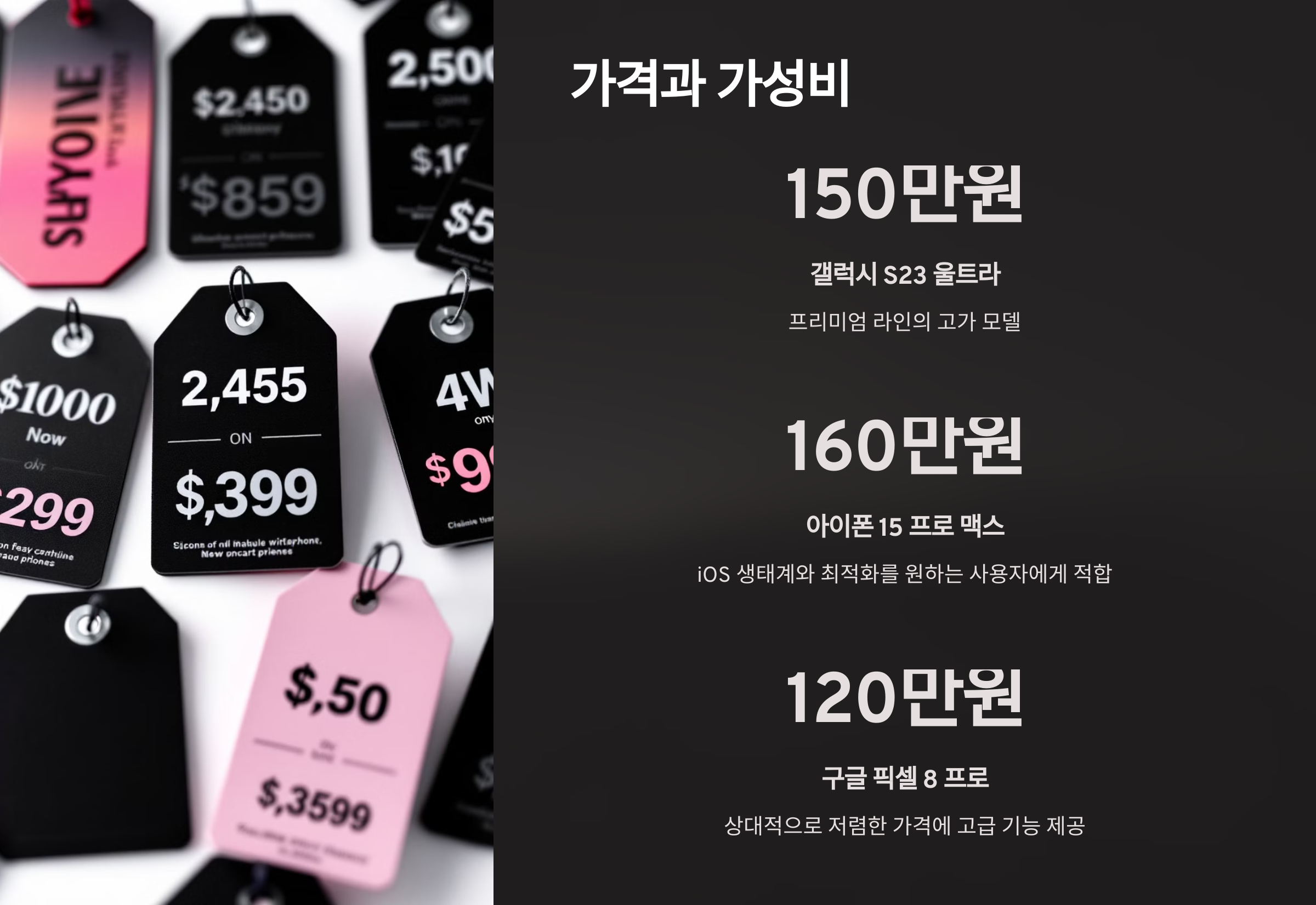 - 구글 픽셀 8 프로: 상대적으로 120만 원대의 가격으로 고급 기능을 제공하며 가성비 측면에서 우수합니다.
