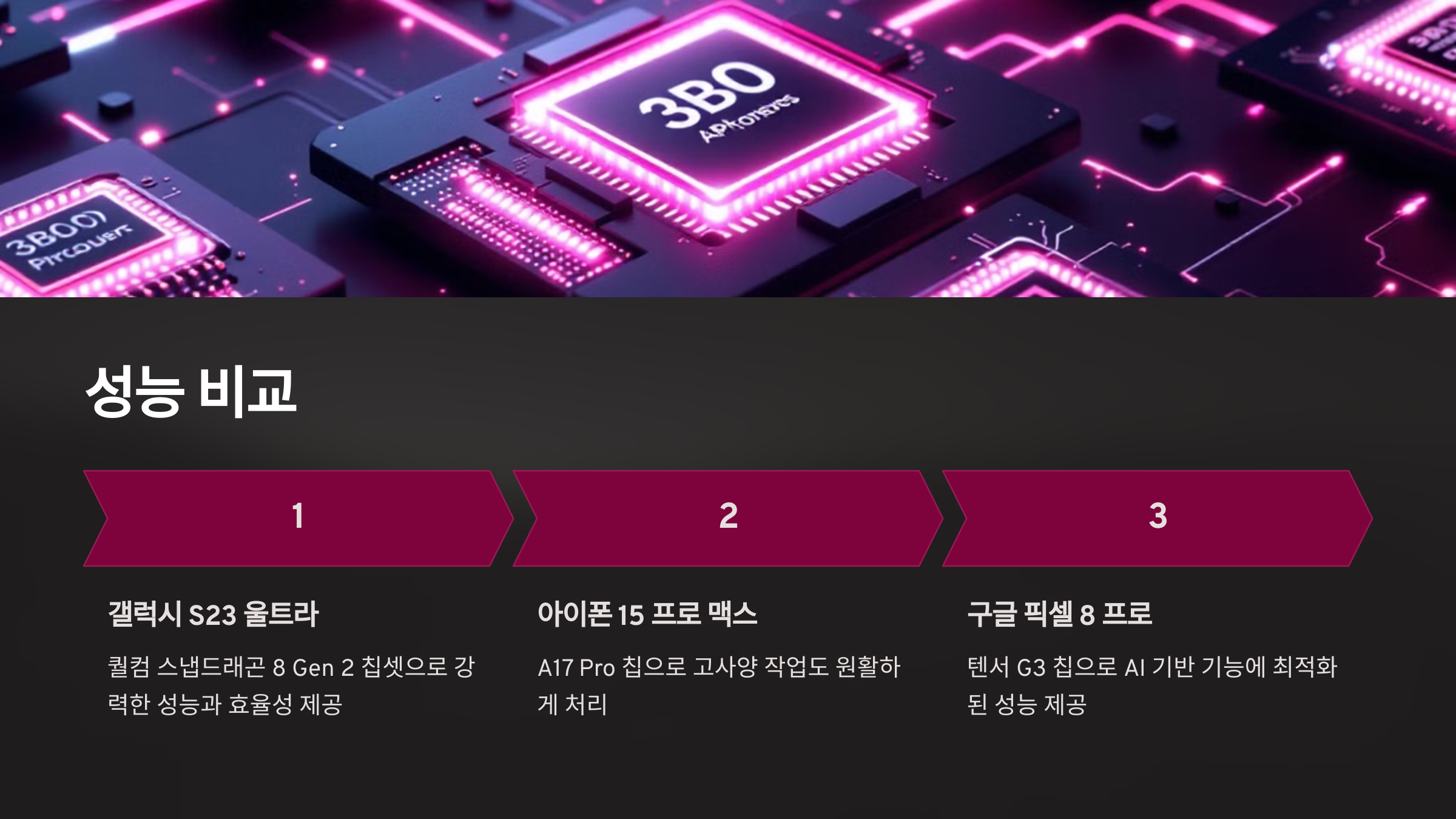 - 아이폰 15 프로 맥스: A17 Pro 칩은 애플의 칩 기술력이 또다시 앞서 나가고 있음을 증명합니다. 모바일 게임과 비디오 편집 같은 고사양 작업도 문제없습니다.